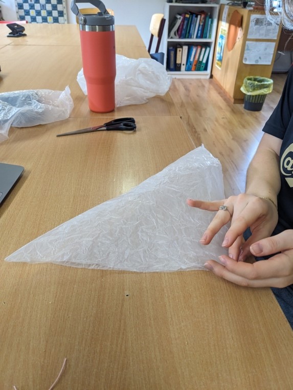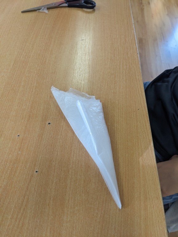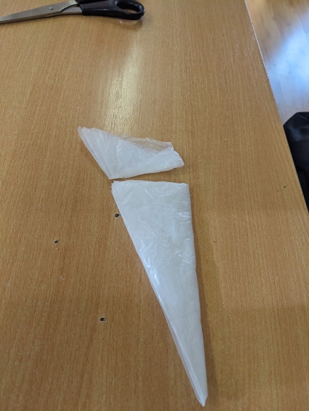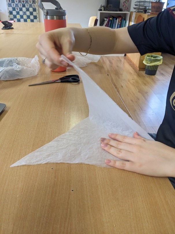 - Cut the bottom in a straight line so both sides of the plastic bag are open.