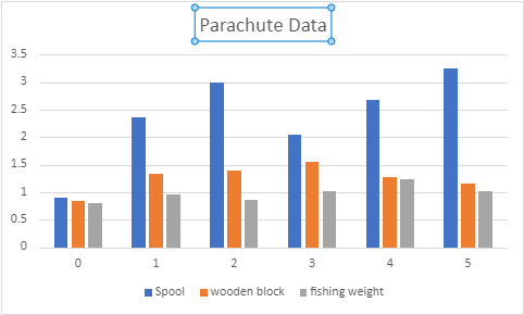 The parachute was most effective on the spool, since it had the lightest mass and least effective on the fishing weight, since it had the heaviest mass. Our results are illustrated in the graph above. Drop 0 was the control trial where the object was dropped by itself so that we could show how much the parachute affects the speed of the fall. Without the parachute, all three of the objects were falling at the same acceleration of –9.81 m/s2 so we only had to do the control trial once. From the graph, it is clear that the parachute had the greatest effect on the spool because the trials done with the parachute were much slower than when the spool was dropped by itself (Slowed it down by 296%). The parachute had the smallest effect on the fishing weight because the times for the trials with the parachute versus without are very similar (Slowed it down by 126%).