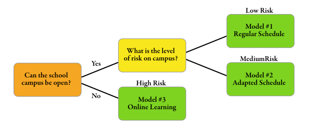 This document is meant to outline three different educational models as they pertain to the current known considerations. We recognize that we must remain flexible and that we may be in a situation requiring us to shift from one model to another. We understand that with each model, we will need to share many more important and specific details. As we understand that some government guidelines and health recommendations may change before August, we will plan to share more specific details as we approach the start of school.